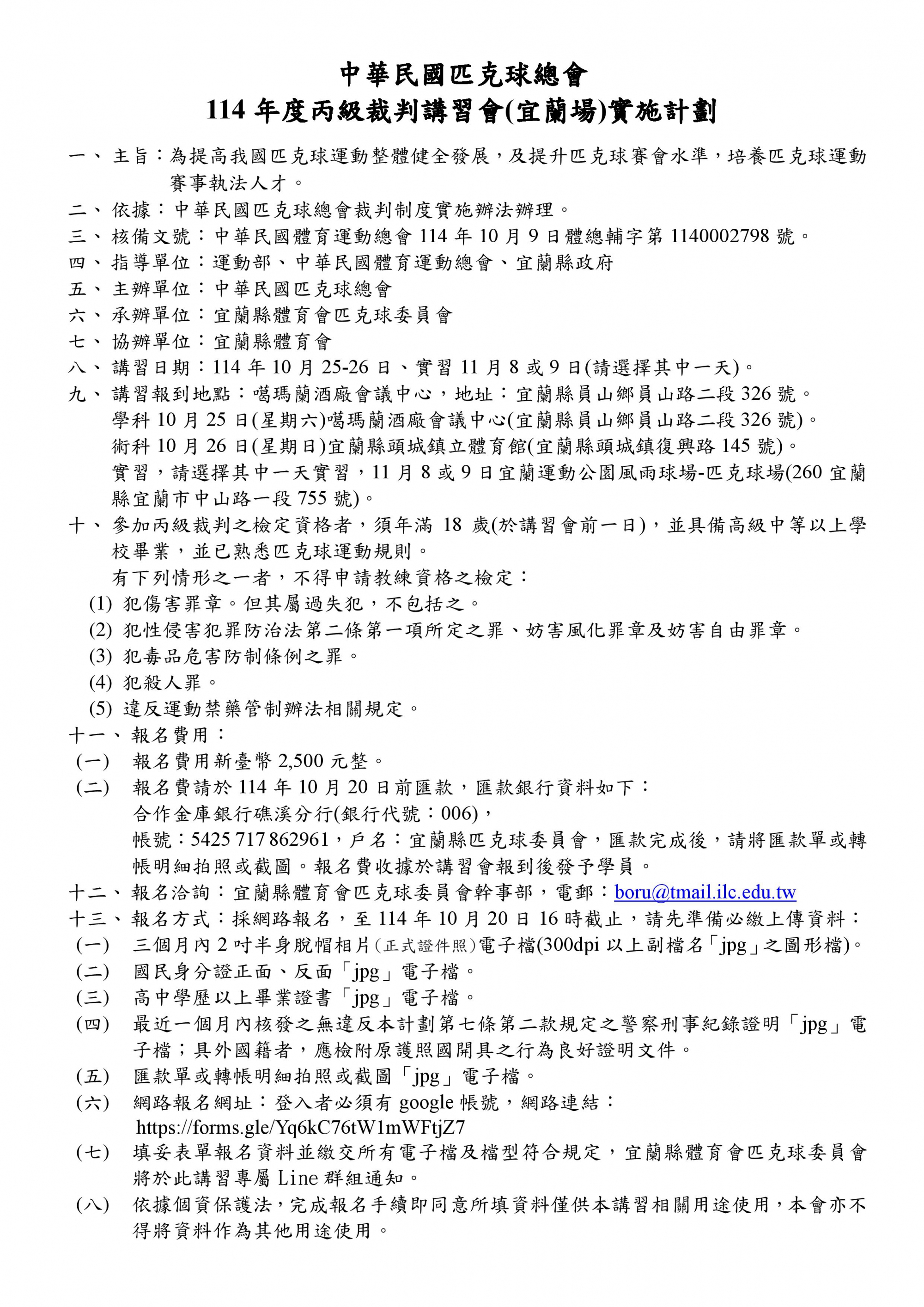 114年丙級匹克球裁判講習會(宜蘭場) 開始受理報名114年丙級匹克球裁判講習會(宜蘭場)