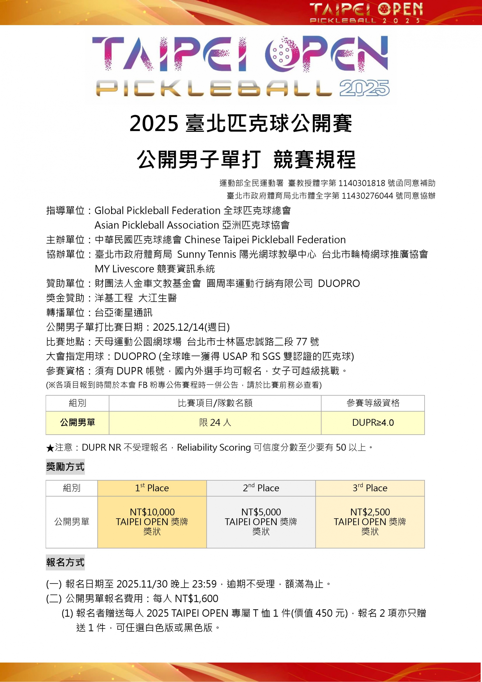 參賽資格:須有DUPR帳號,國內外選手均可報名,女子可越級挑戰。