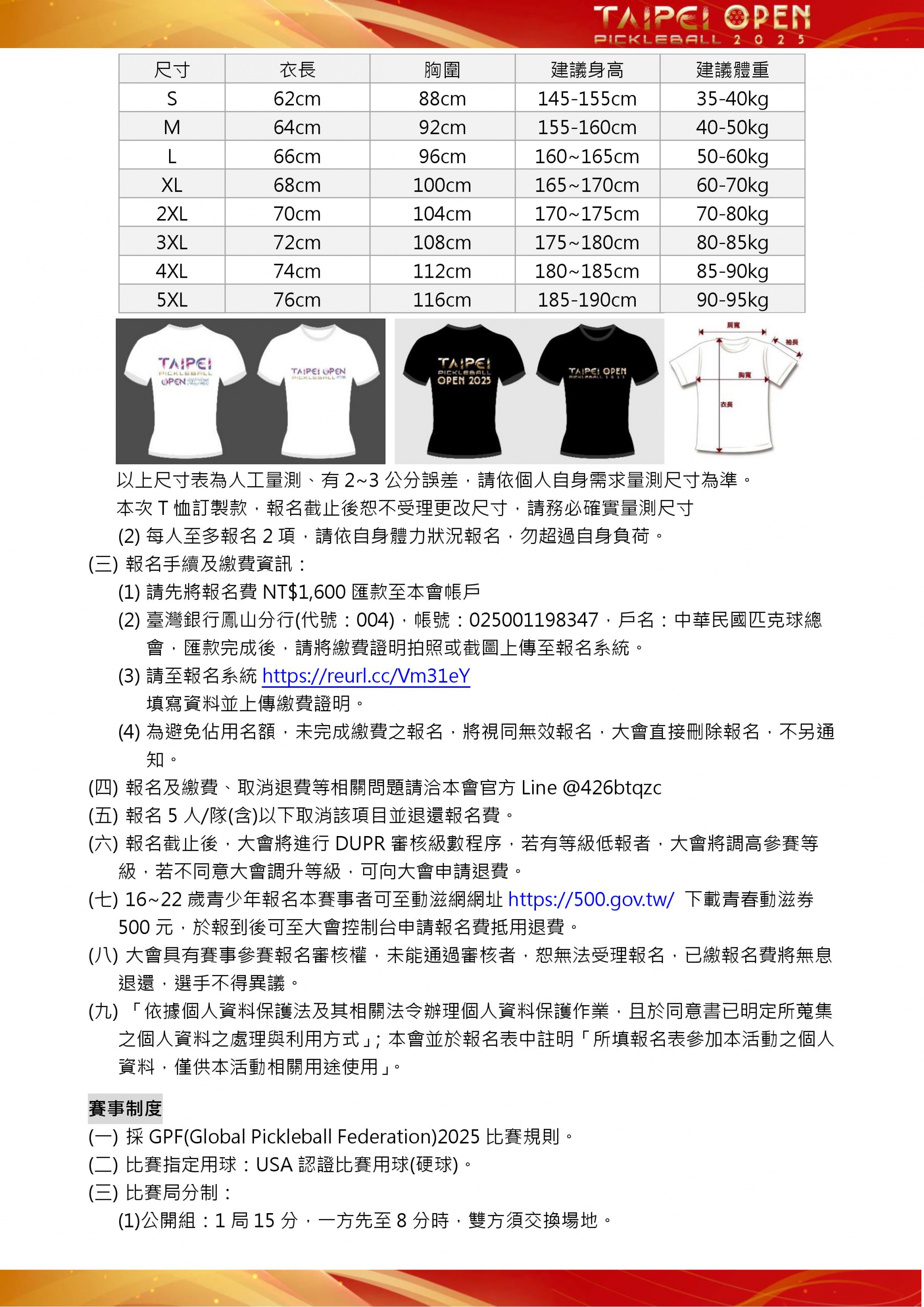 報名者贈送每人2025 TAIPEI OPEN專屬T恤1件(價值450元),報名2項亦只贈送1件,可任選白色版或黑色版。