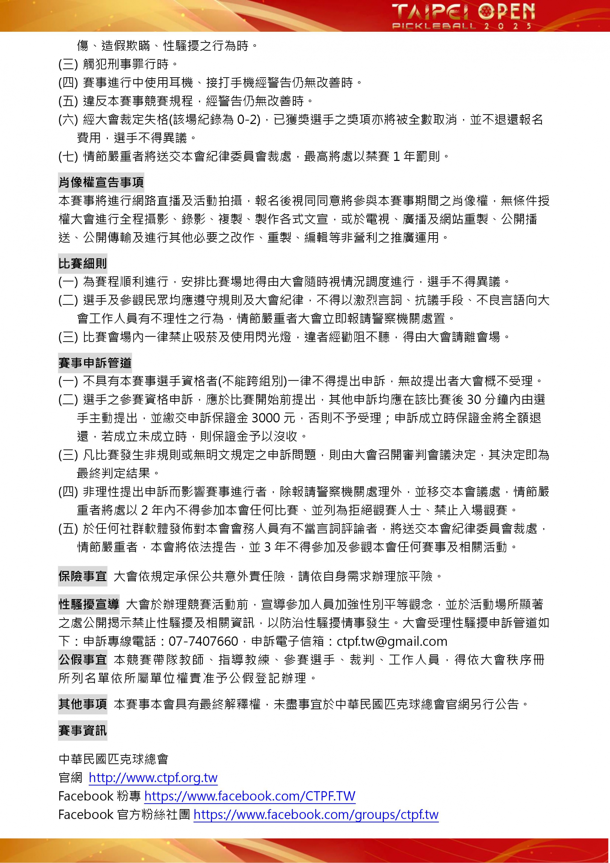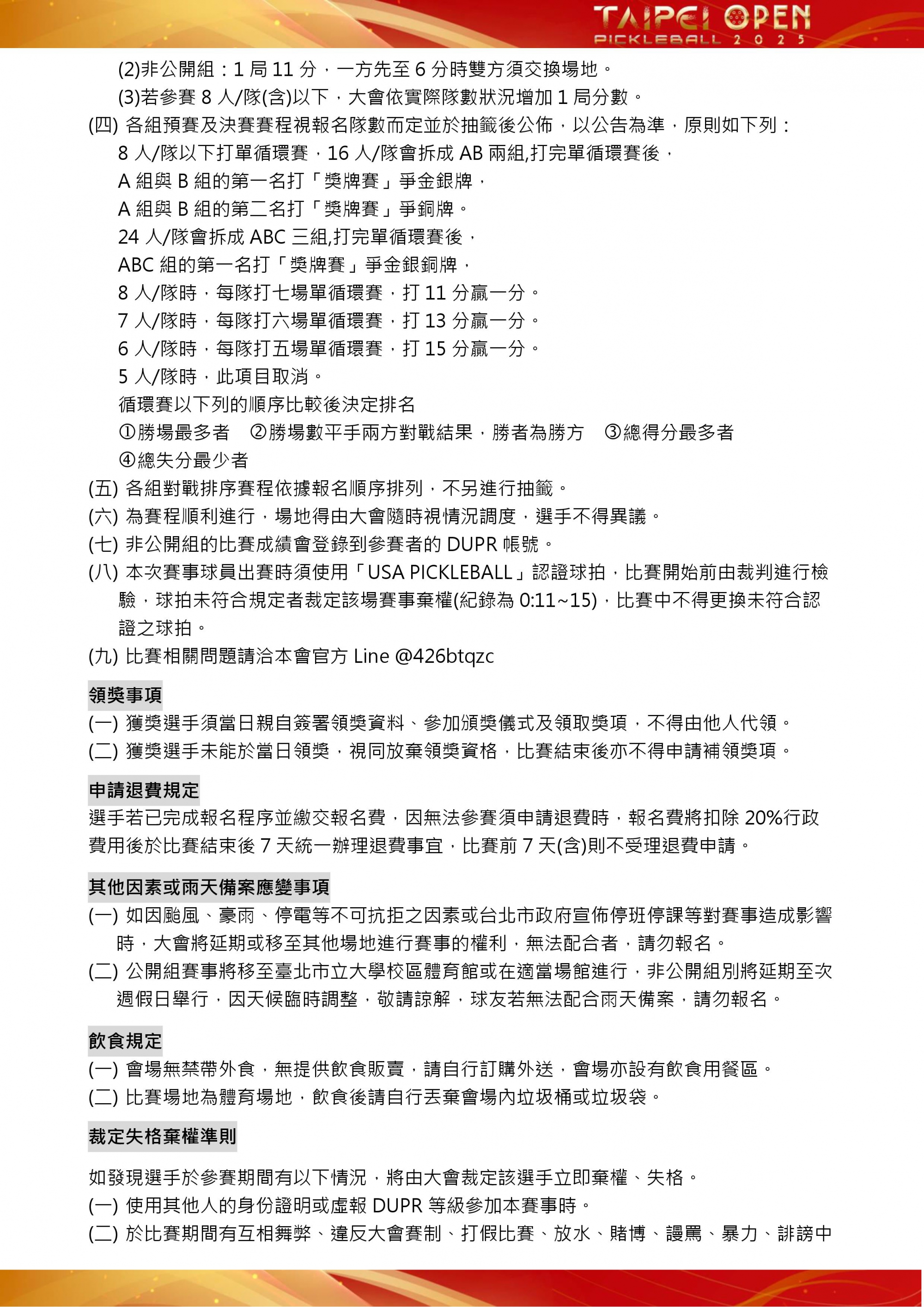 (六)報名截止後,大會將進行DUPR審核級數程序,若有等級低報者,大會將調高參賽等級,若不同意大會調升等級,可向大會申請退費。