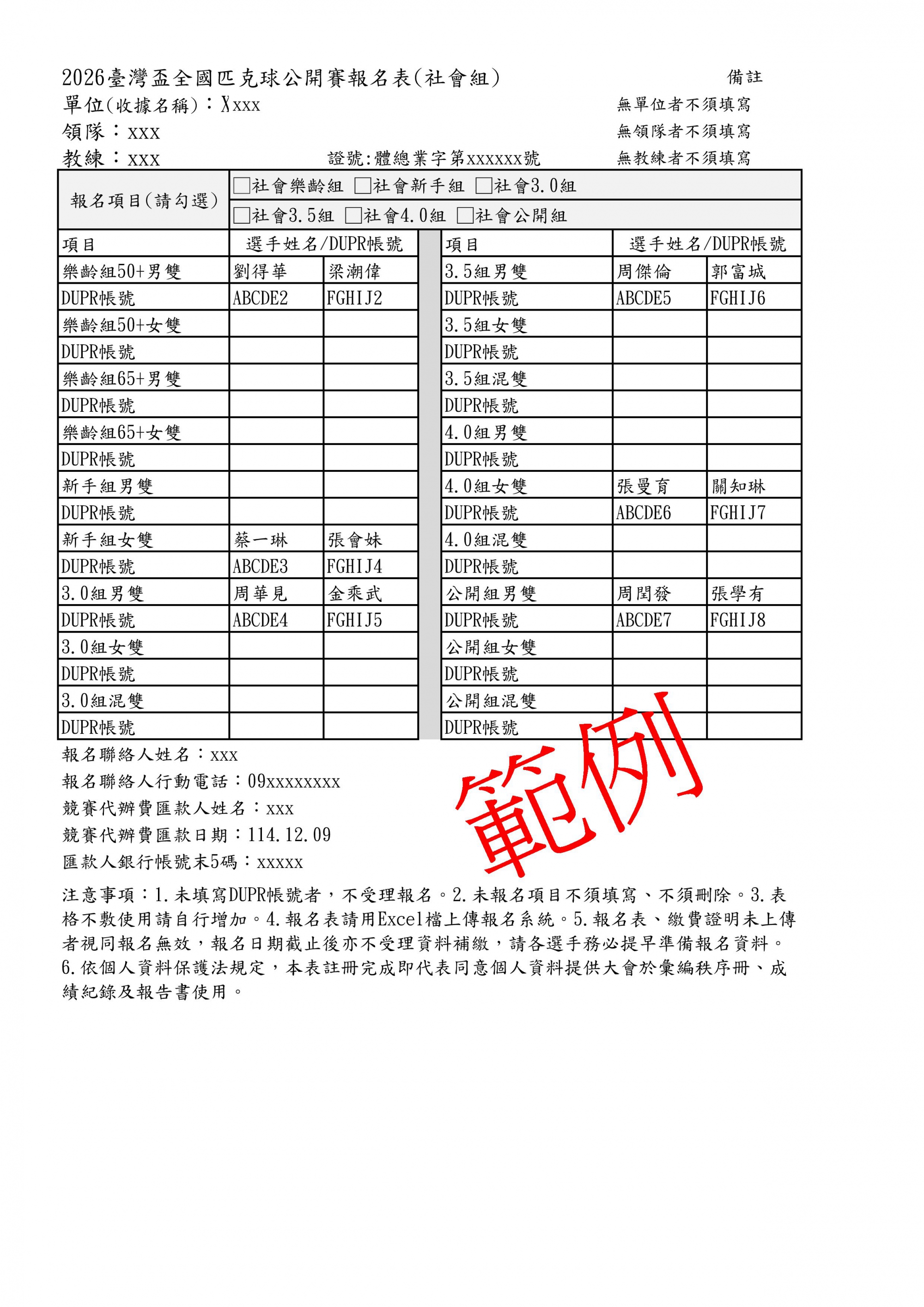 EXCEL報名表填寫完成(請參考範例圖示),連同繳款證明(截圖或拍照)上傳至報名系統 https://reurl.cc/VmMkdR