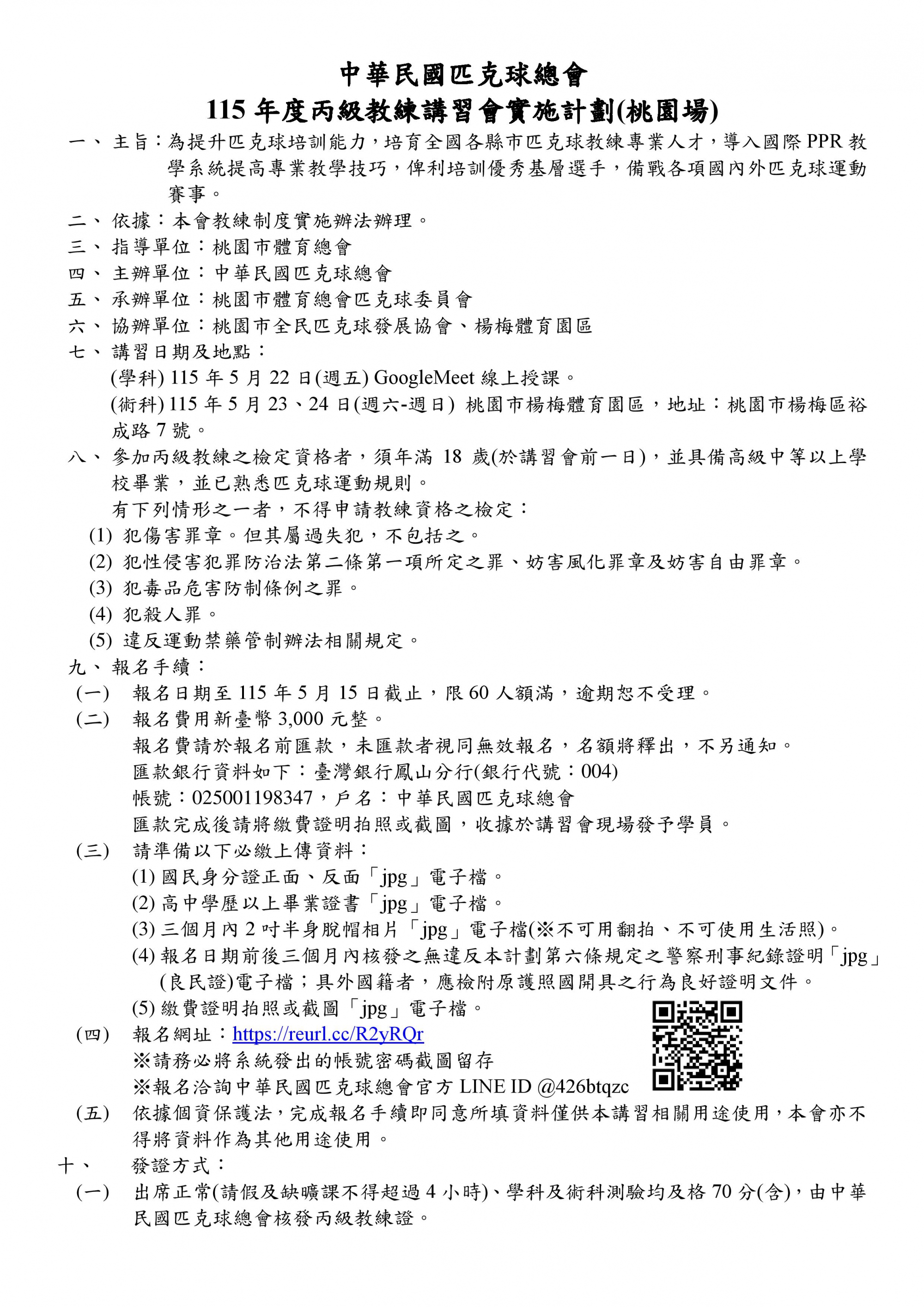 115年度丙級匹克球教練講習會(桃園場)開始報名名額限60人